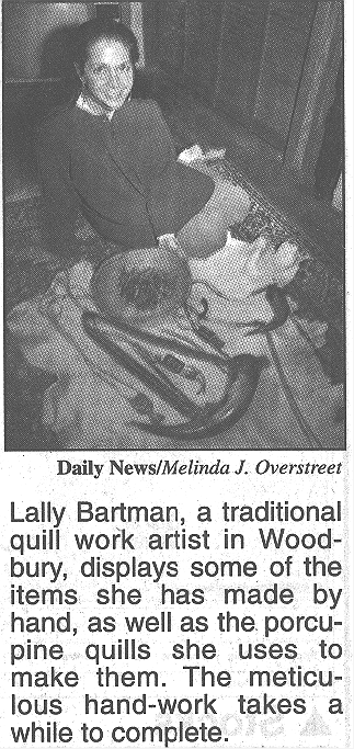 WOODBURY-- Not too many people can take porcupine quills and turn them into artwork, but Lally Bartman has been doing it for 24 years. All of her designs are derived from Eastern Woodlands Indians' traditional designs. Quills can be used in at least half a dozen traditional techniques. The most common involve embroidering the quills on top of leather, wrapping quills around rawhide or leather thongs, which are stringlike strips of leather, and weaving quills into linen thread on a loom and then embroidering it onto leather with linen thread. Bartman does her quillwork on only smoked, brain tanned leather from deer, elk or moose. She makes items as they are ordered and rarely has any extra items around her Butler County home. Art collectors have purchased some of her larger items, she says and she meets many of her customers at living history events, primitive rendezvous, and juried trade shows that she and her husband Frank House, a flintlock gunmaker, attend. "I'll quill any accouterment traditionally correct prior to 1790," Bartman says. Powder horn straps, leg ties, neck bags, knife sheaths, and hair ornaments are her most commonly made items. She has made about 10 hunting bags, but they take alot of thought for the design, and the quillwork itself is a very time consuming art form, she says. Quillwork was the primary method of adornment before beads became a dominant trade item in the early 1800's, Bartman says. "Once beadwork became predominant, they virtually quit quillwork because there was so much preliminary work to do for dyeing," she says. Most of her skills have been self taught by trial and error, visiting alot of museums, and doing alot of research, she says, "but I did learn one technique from an older lady when I was 17 years old. That's when I became interested in quillwork and traditional art forms." For the past nine years, quilling has been Bartman's sole source of income. "That we know of, there are about 10 who still do Eastern Woodlands quillwork. Of those, four that we know of make their sole living from it," she says. But she is the only person in the country that she knows of who still uses only natural dyes from plants, fruits and bugs: yellow root for a golden yellow color, blood root for orange, indigo plant for blue, sumac berries for tan, walnuts for brown, wild grapes for black, and cochineal insects for red. For green, she uses indigo with an overbath of yellow root. In the autumn, when berries are at their fullest potency, Bartman dyes enough quills to last her a year. One porcupine can yield more than a bushel basketful of quills of different sizes. Friends living in northern states find porcupines that have been killed on the roads, skin them and send her the hides with quills attached. Bartman plucks or shaves off the quills and cleans the animal fat off so they will take the natural dye better. After the quills are dyed they must be wet before she can work with them. |